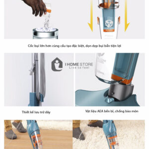 Deerma DX900 chỉ nặng khoảng 1,8kg, cấu tạo theo chiều dọc. Về tổng thể, chiếm diện tích trong không gian gia đình bạn như một cây chổi lau và quét nhà thông thường. Thậm chí màu xanh cùng thiết kế khá trang nhã có thể khiến chiếc máy hút bụi này trở thành đồ vật làm tăng tính thẩm mỹ trong gia đình bạn.