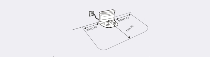 Đế sạc cần được đặt dựa vào tường, không để các vật gây cản trở robot trong quá trình tìm về ổ sạc, không gian xung quanh với 1,5m ở phía trước và 0,5m ở hai bên sạc cần được để thông thoáng.